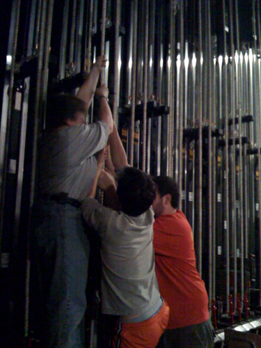 Tech is going a little slowly, but no crises have come up. There's some preliminary talk of eliminating some parts of the set because it currently appears to be too complex to set up in the time we will generally have for load-ins, and with the traveling crew we will have. That's a discussion that's still in progress though.